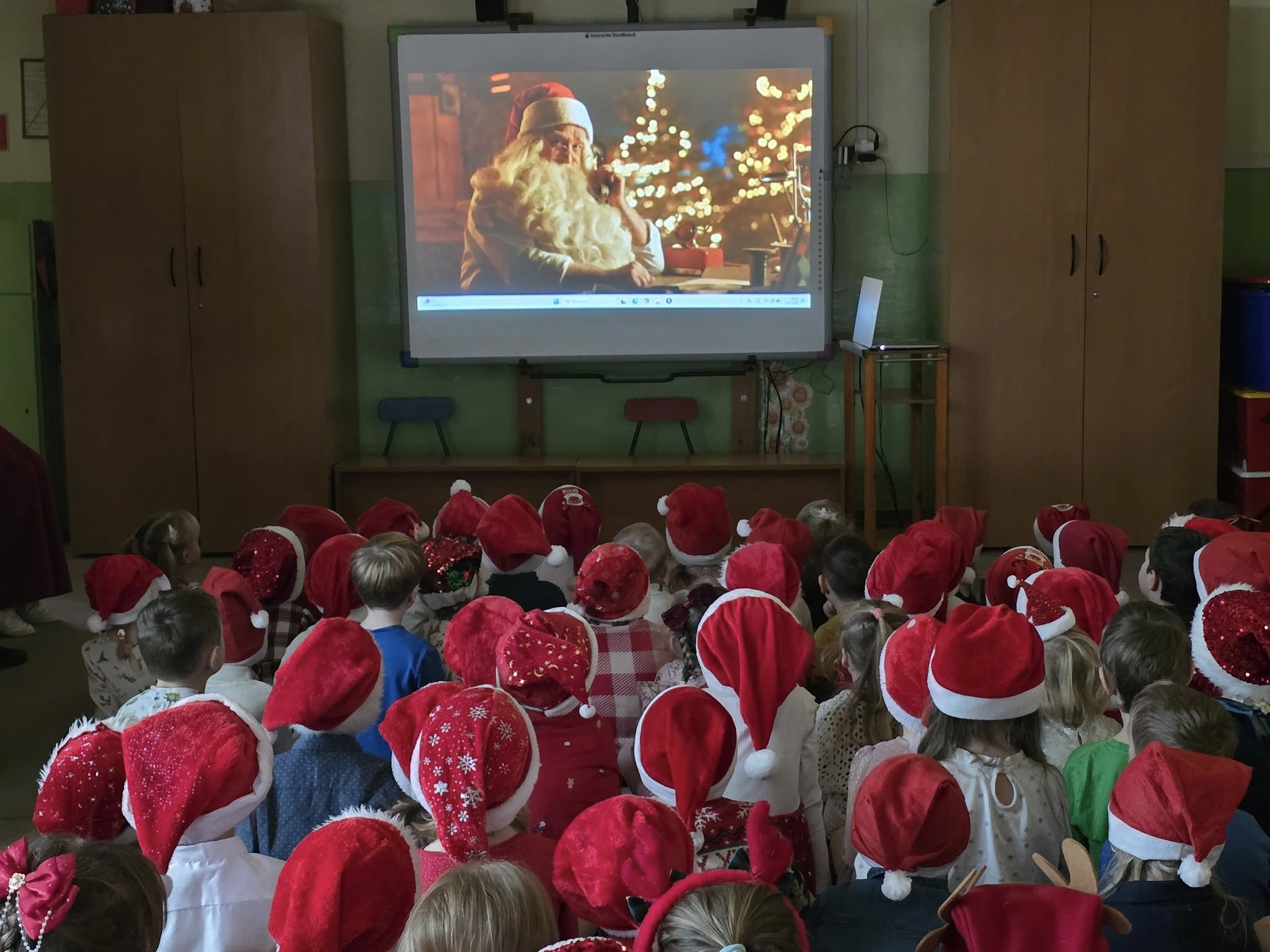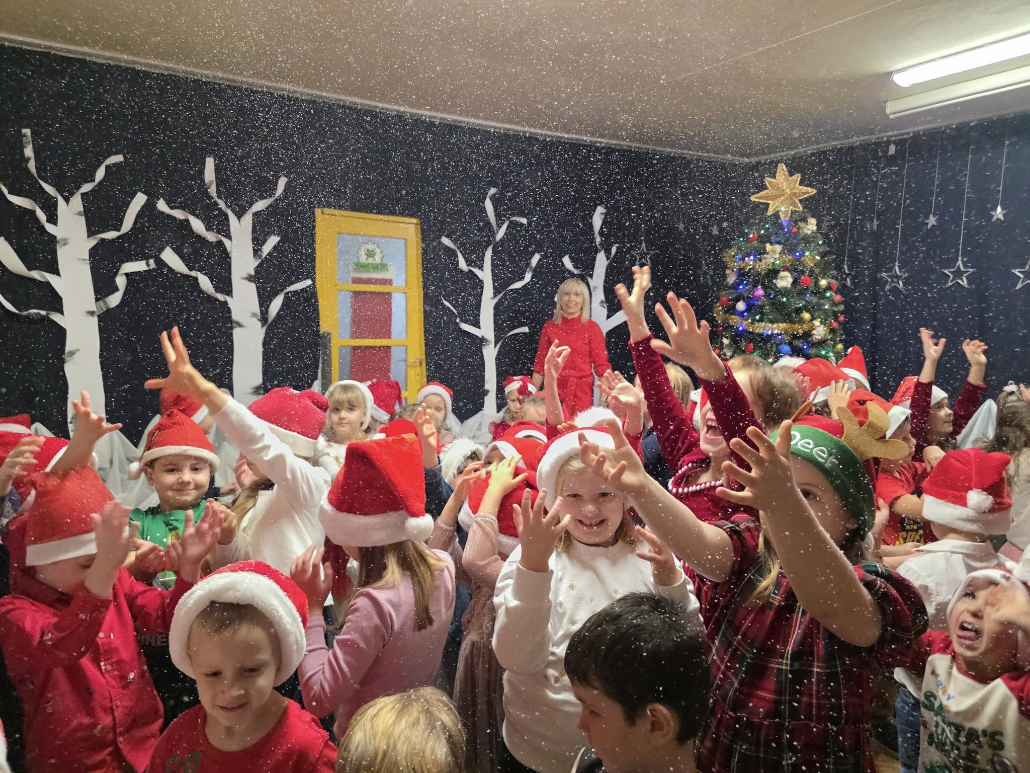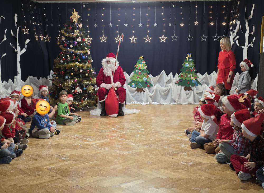W naszym przedszkolu odbył się wyjątkowy i pełen radości Bal z Mikołajem, na który dzieci czekały z wielkim podekscytowaniem. Wydarzenie rozpoczęło się od obejrzenia specjalnego filmu od Świętego Mikołaja, który serdecznie pozdrowił przedszkolaki i zapowiedział swoje przybycie. Wyjaśnił również, że jego podróż z dalekiej Laponii nieco się opóźniła z powodu niesprzyjających warunków pogodowych, prosząc dzieci o cierpliwość i uśmiech. Czas oczekiwania minął bardzo radośnie i aktywnie. Dla dzieci przygotowano wiele ciekawych atrakcji. Grupy Biedronki i Motylki z ogromnymzaangażowaniem dekorowały choinki, natomiast Żabki i Pszczółki brały udział w zabawie ruchowej ze „śnieżkami”, rozwijając swoją sprawność i współpracę w grupie. Nie zabrakło także wspólnych tańców przy dźwiękach znanych i lubianych piosenek świątecznych, które wprowadziły wszystkich w magiczny, bożonarodzeniowy nastrój. Najbardziej wyczekiwanym momentem była oczywiście wizyta Świętego Mikołaja. Dzieci powitały go z radością i entuzjazmem, a następnie pięknie zaśpiewały przygotowaną piosenkę. Mikołaj obdarował wszystkich przedszkolaków prezentami, wywołując uśmiechy na twarzach i wiele pozytywnych emocji.