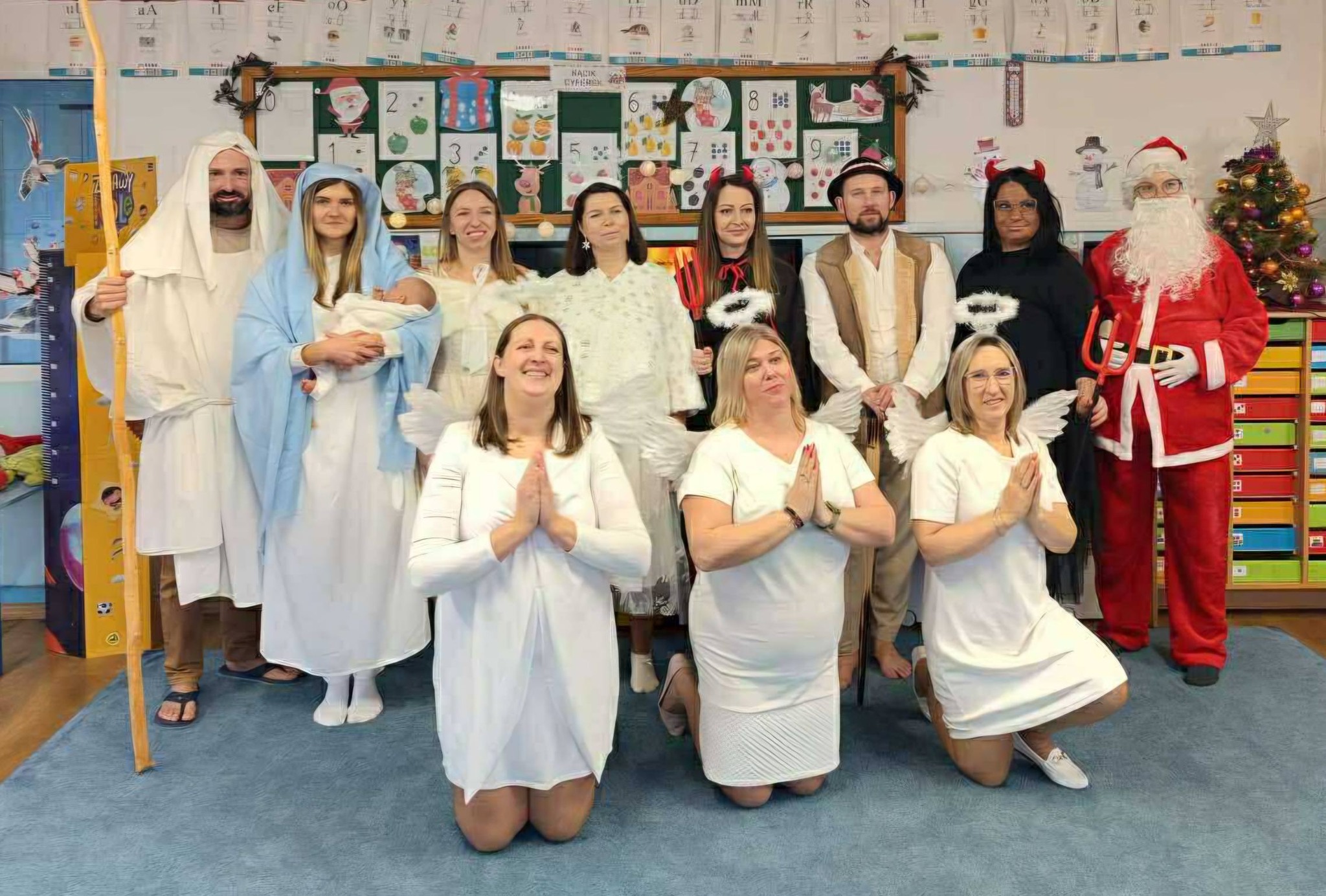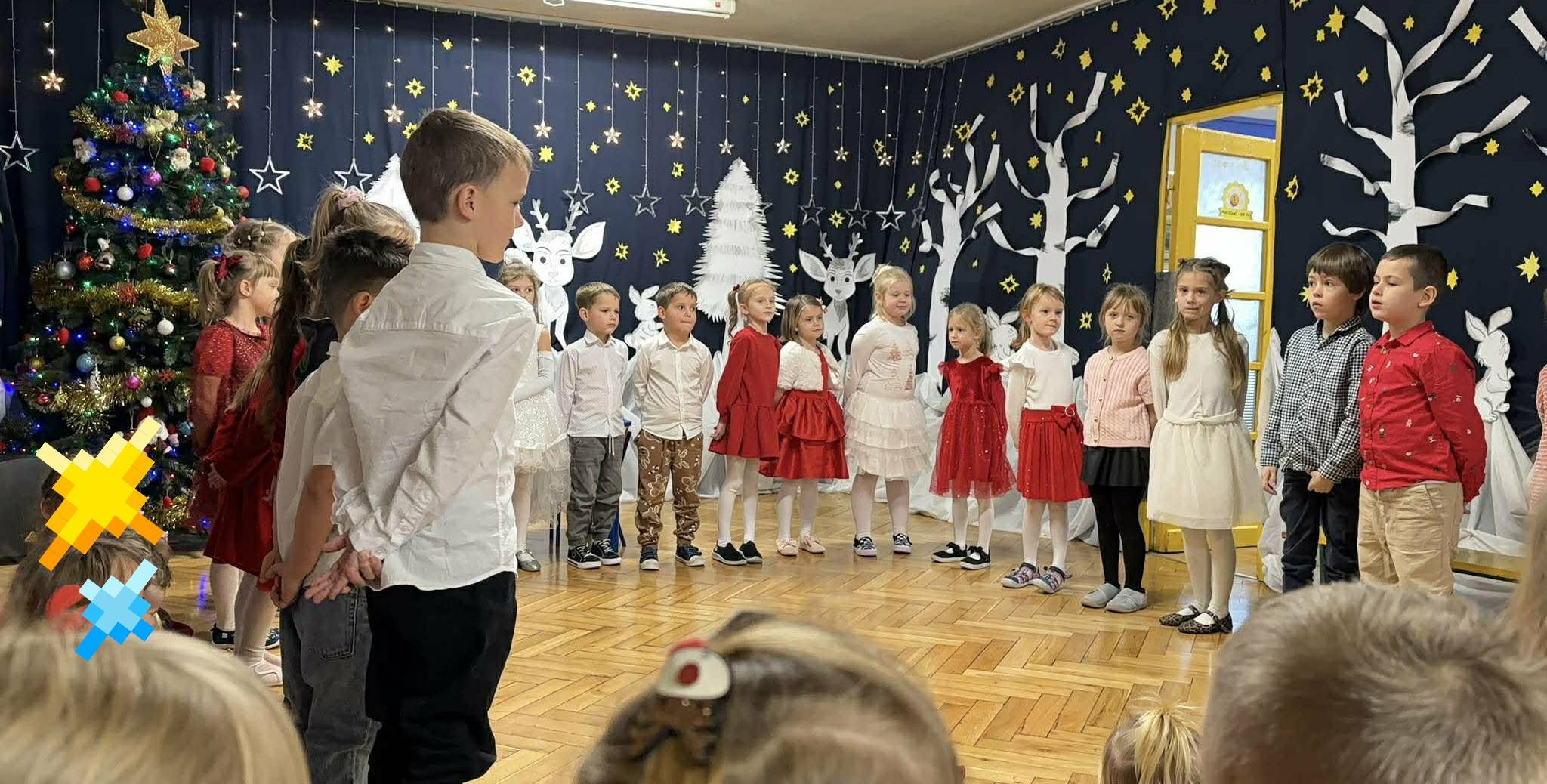 18 grudnia w naszym przedszkolu odbyła się wyjątkowa uroczystość choinkowa, która na długo pozostanie w pamięci dzieci, rodziców oraz nauczycieli. Tegoroczne spotkanie różniło się od tych z poprzednich lat, ponieważ w rolę artystów wcielili się… Rodzice! Rodzice przedszkolaków przygotowali piękne przedstawienie jasełkowe pt. „Kłopoty Pierwszej Gwiazdki”. Występ dostarczył widzom wielu wzruszeń, radości i uśmiechu, a jego świąteczne przesłanie wprowadziło wszystkich w wyjątkowy bożonarodzeniowy nastrój. Dzieci z ogromnym zainteresowaniem oglądały swoich najbliższych na scenie, nagradzając ich gromkimi brawami. Uroczystość uświetniły także przedszkolaki, które włączyły się w program artystyczny, śpiewając świąteczne piosenki oraz kolędy. Po zakończeniu części artystycznej dzieci wraz z rodzicami i bliskimi udały się do sal na wigilie klasowe. Był to wyjątkowy czas pełen ciepła i bliskości – składano sobie świąteczne życzenia, dzielono się opłatkiem oraz celebrowano wspólnie ten szczególny moment. Przedszkolaki wręczyły rodzicom własnoręcznie przygotowane upominki, wyrażając w ten sposób swoją wdzięczność i miłość. Spotkanie zakończyło się wspólnym poczęstunkiem, rozmowami i radosnym spędzaniem czasu w rodzinnej atmosferze. Uroczystość choinkowa stała się pięknym wprowadzeniem w nadchodzące Święta Bożego Narodzenia.